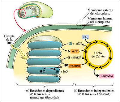 Los tilacoides están rodeados por un fluido denominado estroma. En el estroma tiene lugar la fase oscura de la fotosíntesis (o Ciclo de Calvin), en ella se fijan las moléculas de dióxido de carbono (gracias a la energía y poder reductor de la fase luminosa), formándose materia orgánica ---> el principal objetivo de todo el "proceso".